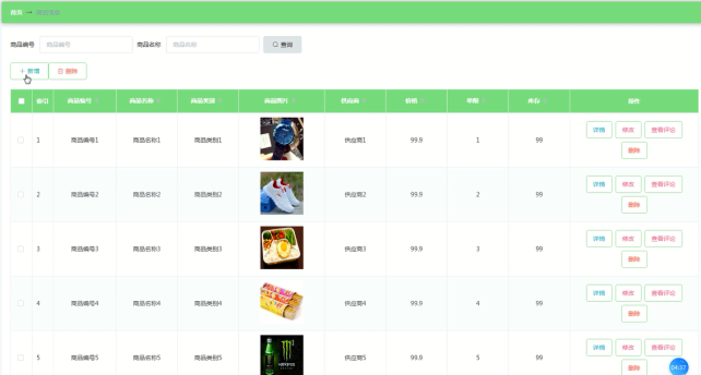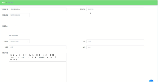 管理员可增删改查商品信息,商品信息管理界面展示如图5-10所示,添加商品信息界面展示如图5-11所示 。
