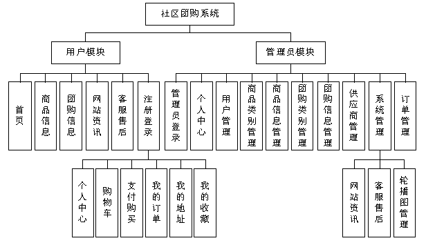 本基于Spring Boot的社区团购系统主要包括用户模块和管理员模块,根据第三章中系统功能需求分析,可画出本基于Spring Boot的社区团购系统的结构图如图4-1所示: