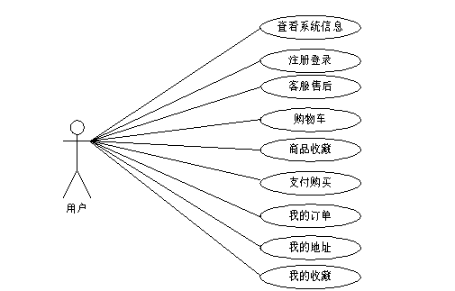 (1)用户:用户在系统前台可查看系统信息,包括首页、商品信息、团购信息、网站资讯等,注册登录后主要功能模块包括客服售后、购物车、商品收藏、支付购买、我的订单、我的地址以及我的收藏,用例图如图3-1所示。