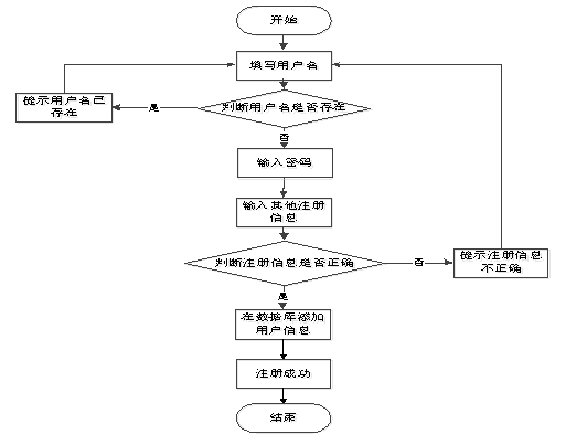 未有账号的用户可进行注册操作,在注册时系统会判断用户名是否已存在,已存在的话,提示返回重新填写用户名,用户名不存在,填写其他注册信息,系统判断注册信息是否正确,正确则在数据库中添加用户信息,注册成功。用户注册流程图如图3-3所示。