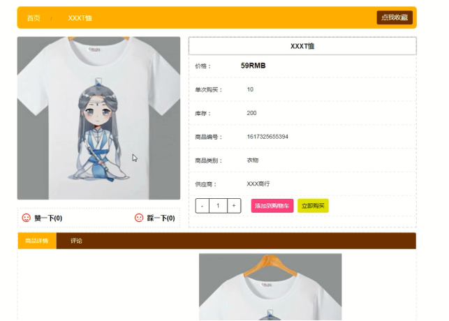 用户可选择商品查看商品详情信息,登录后可进行收藏、加入购物车和购买操作,商品详情界面如图5-4所示。