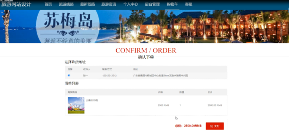 旅游线路:通过列表可以进行查看路线名称、价格、路线分类、景点名称、出发地、目的地、交通方式、出行时间、费用包含、点击次数等信息、进行添加购物车或立即购买、收藏操作,如图5-11所示。用户通过点击立即购买进入页面可以进行选择收货地址进行查看订单信息,进行在线支付操作,如图5-12所示。