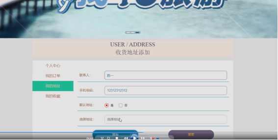 个人中心:通过列表可以进行查看个人中心、我的订单、我的地址、我的收藏等功能,进行相对应操作,个人中心:通过页面可以进行修改用户名、密码、姓名、头像、性别、联系电话、余额等信息,进行更新信息操作,如图5-8所示。我的地址:通过列表可以进行查看联系人、手机号码、默认地址等信息、进行添加地址或重置操作,如图5-9所示。