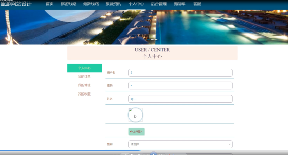 用户登录成功后,可以进行查看个人中心、用户管理、路线分类管理、旅游路线管理、最新路线管理、系统管理、订单管理等功能模块。进行相对应操作。