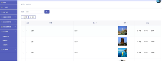 旅游资讯:管理员通过列表可以进行查看标题、简介、图片等信息,进行详情、修改或删除操作,并通过新增进行添加旅游资讯信息或删除操作,如图5-3所示。