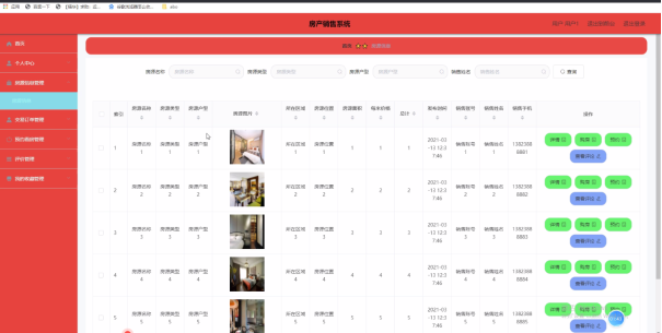 房源信息管理:通过列表可以获取房源名称、房源类型、房源户型、房源图片、所在区域、房源位置、房源面积、每米价格、总计、发布时间、销售账号、销售姓名、销售手机等信息,进行详情、购房、预约、查看评论等操作,如图5-2所示。