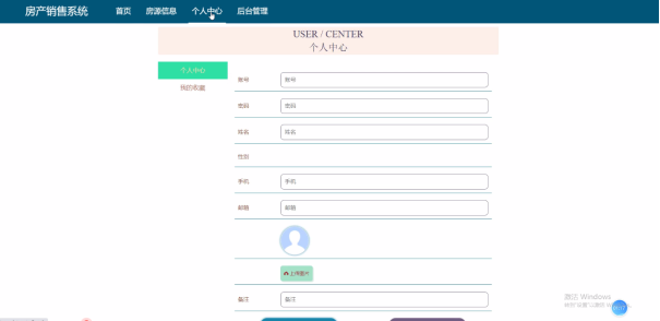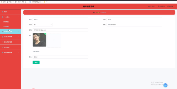 用户点击进入到系统操作界面,可以对首页、个人中心、房源信息管理、交易订单管理、预约看房管理、评价管理、我的收藏管理等功能模块,个人信息:通过列表可以获取账号、姓名、性别、手机、邮箱、照片、备注并进行修改操作,如图5-1所示。