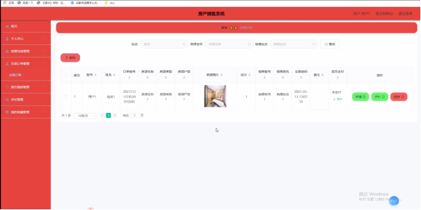交易订单管理:通过列表可以获取账号、姓名、订单编号、房源名称、房源类型、房源户型、房源图片、总计、销售账号、销售姓名、交易时间、备注、是否支付等信息,进行详情、修改或删除操作,如图5-11所示。