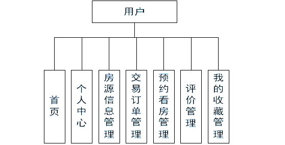 用户注册登录后可进行首页、个人中心、房源信息管理、交易订单管理、预约看房管理、评价管理、我的收藏管理,用户用例如图3-2所示。
