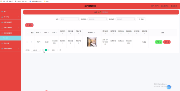 预约看房管理:通过列表可以获取账号、姓名、手机、房源名称、房源类型、房源户型、房源图片、预约时间、销售账号、销售姓名、销售手机、审核回复、审核状态等信息,进行详情、删除操作,如图5-4所示。