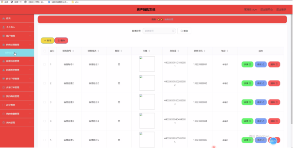 销售经理管理:通过列表可以获取销售账号、销售姓名、性别、头像、身份证、销售手机、年龄等信息,进行详情、删除或修改等操作,如图5-7所示。