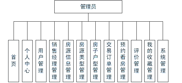 管理员登录后可进行首页、个人中心、用户管理、销售经理管理、房源信息管理、房源类型管理、房子户型管理、交易订单管理、预约看房管理、评价管理、我的收藏管理、系统管理,管理员的用例如图3-1所示。