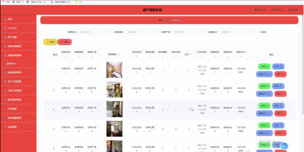 房源信息管理:通过列表可以获取房源名称、房源类型、房源户型、房源图片、所在区域、房源位置、房源面积、每米价格、总计、发布时间、销售账号、销售姓名、销售手机等信息,进行详情、修改、查看评论、删除等操作,如图5-8所示。