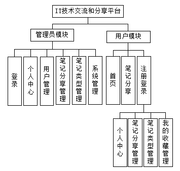 系统结构设计是一个将一个庞大的任务细分为多个小的任务的过程,这些小的任务分段完成后,组合在一起形成一个完整的任务。本基于Spring Boot的IT技术交流和分享平台主要管理员模块以及用户模块两大部分,系统结构图如图4-1所示。