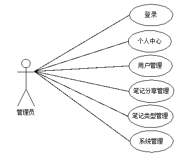 管理员登录后可对系统进行全面管理,管理员主要实现的功能模块包括个人中心、用户管理、笔记分享管理、笔记类型管理以及系统管理五大部分,管理员用例图如图3-3所示。