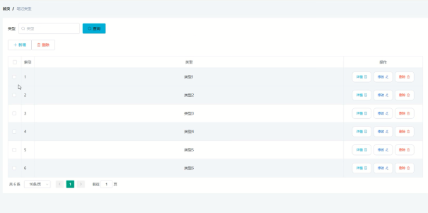管理员可增删改查笔记类型信息,笔记类型管理界面展示如图5-9所示。