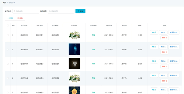 管理员可增删改查笔记分享信息,笔记分享管理界面展示如图5-10所示。