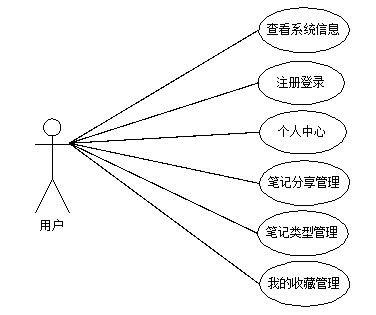 用户进入本系统可查看系统信息,包括首页、笔记分享,注册登录后主要功能模块包括个人中心、笔记分享管理、笔记类型管理以及我的收藏管理,用户用例图如图3-1所示。