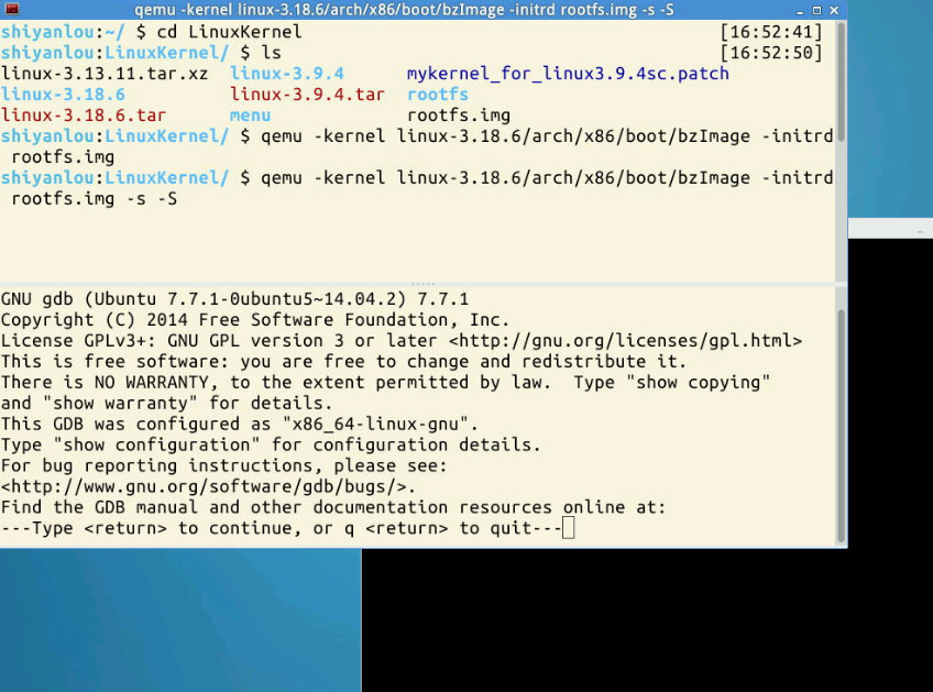建立gdb和gdbserver之间的连接,按c 让qemu上的Linux继续运行