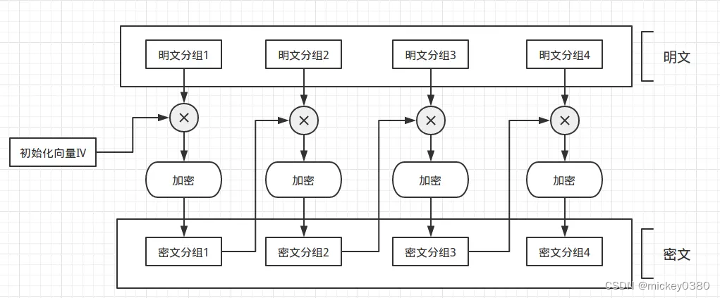 CBC 模式的全称是Cipher Block Chaining模式(密文分组链接模式),之所以叫这个名字,是因为密文分组是像链条一样相互连接在一起的。