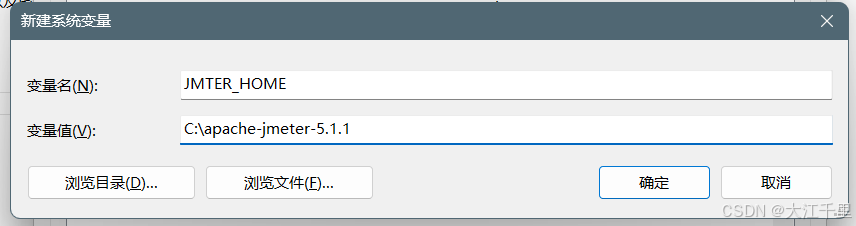 需要在系统变量中添加一个变量:JMETER_HOME,值为jmeter解压目录,不带bin;path中的带bin目录,即:C:\apache-jmeter-5.1.1\bin。