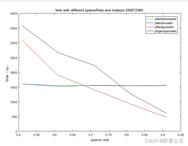 为了验证随着稀疏率的越增加,稀疏矩阵乘法的速度与稠密矩阵乘法速度差距越大的这个观点,我们给出固定矩阵尺寸为2560*2560,观察不同稀疏率对矩阵乘法速度的影响,结果如图7所示。对于Eigen库的稀疏矩阵乘法来说,当稀疏率达到0.8左右,稀疏矩阵与向量的乘法的耗时就比稠密矩阵与向量的乘法的耗时要少了。同样的对于基于MKL库的稀疏矩阵来说,稀疏率达到0.7左右就可以了。所以上述的观点得到了验证。