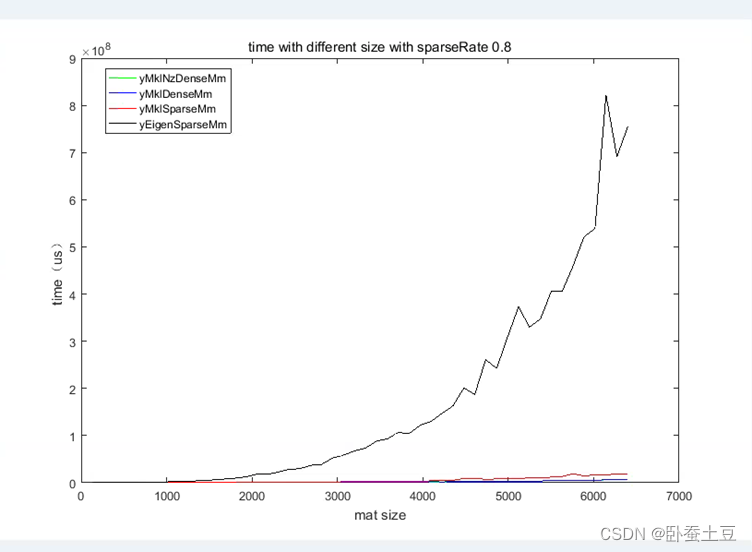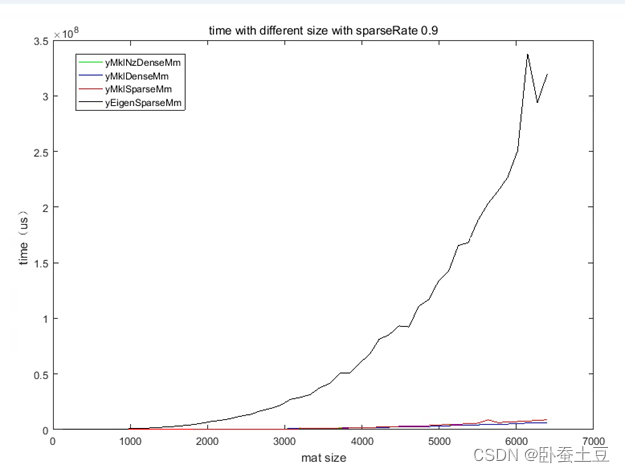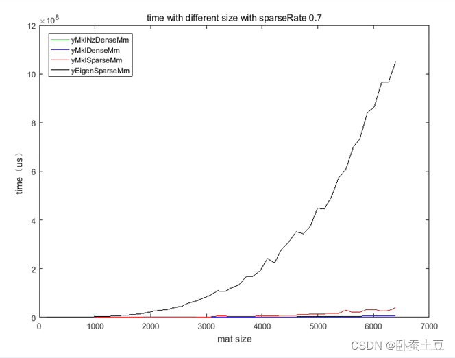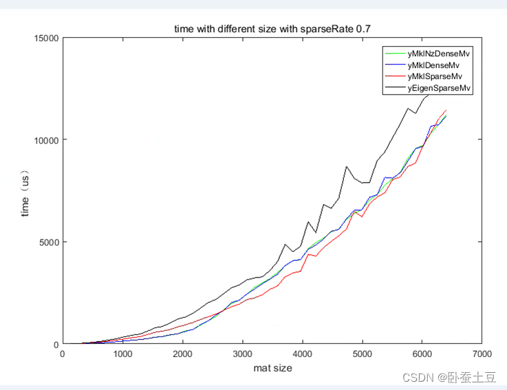 可以看出稀疏率为0.7的时候随着矩阵尺寸变大,稠密矩阵乘以向量和稀疏矩阵乘以向量的耗时基本上差不多。并且对比yMklNzDenseMv和yMklDenseMv可以看出稠密矩阵中0元素的多少对于稠密矩阵的运算没有影响。而基于Eigen的稀疏矩阵的乘法的速度和Mkl库还是有一定差距。