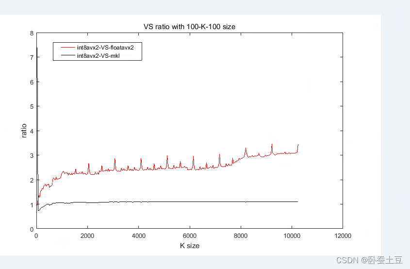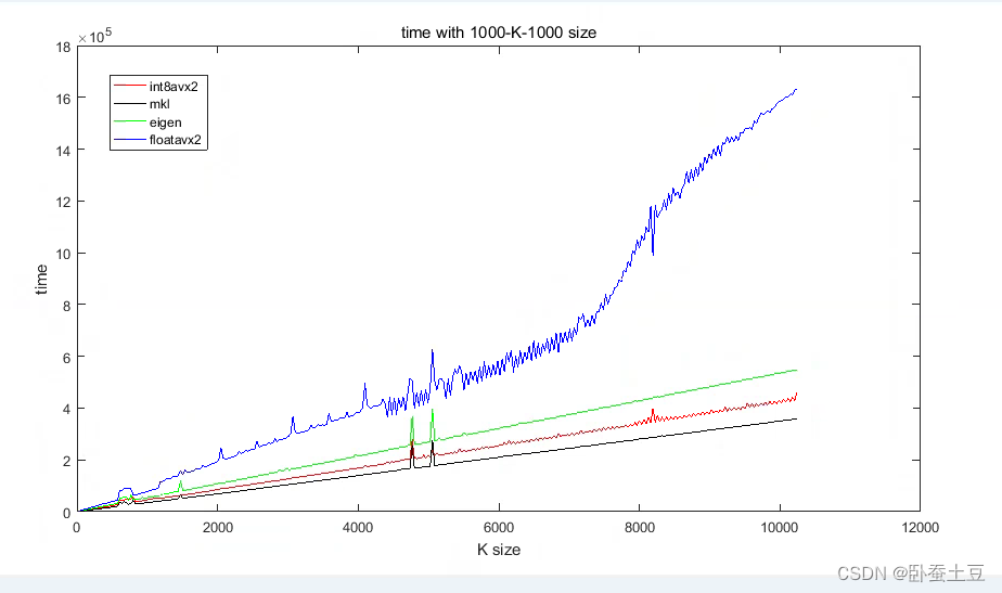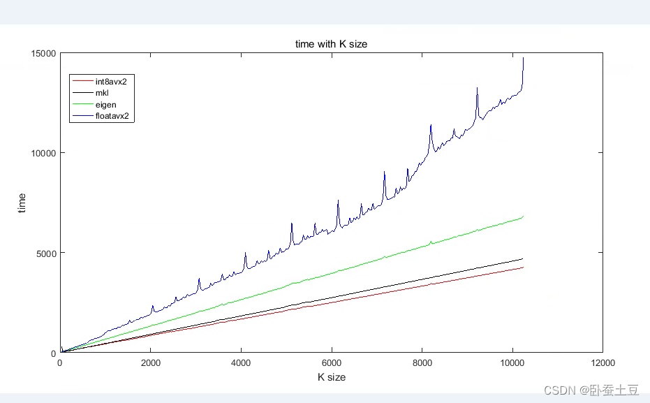 。可以看出,随着K的增大int8avx2方法是最快的,其次是mkl,eigen,最后是floatavx2的方法。并且有mkl的耗时和int8avx2的方法很接近。