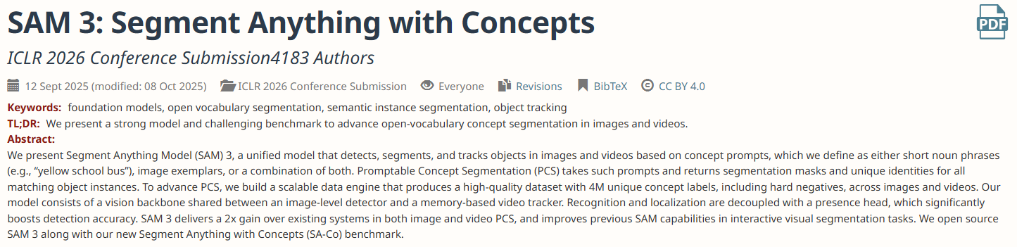 第三代“分割一切”模型(Segment Anything Model, SAM 3)的研究论文已匿名投稿至ICLR 2026会议并被公开。该论文目前正处于双盲评审阶段。这项工作在SAM系列模型的基础上,实现了从交互式提示到概念理解的关键性跨越。