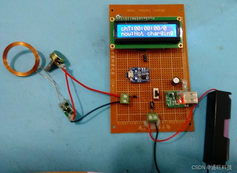 4、液晶显示是否在充电状态。无线充电器模块分两部分,一部分12V供电输出感应,另一部分接收感应输出5V给锂电池充电。