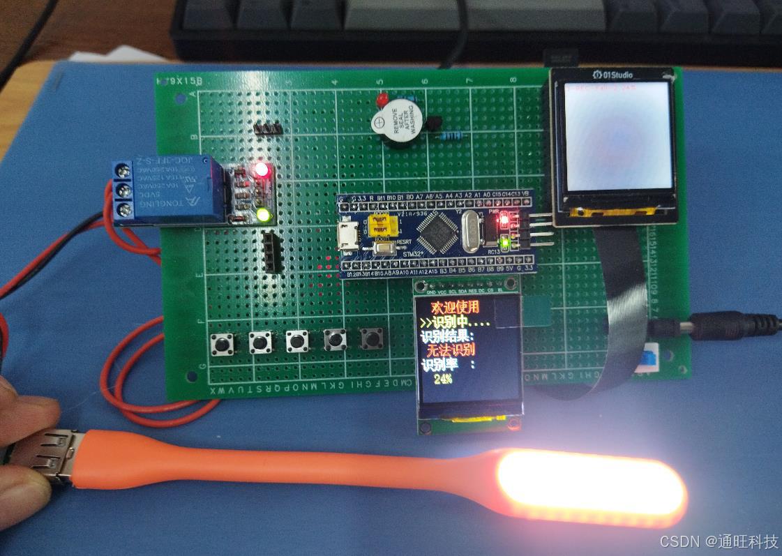 2、摄像头实时识别图像信息,液晶显示识别的结果、识别流程及识别率。识别成功后,蜂鸣器鸣叫几声提醒。