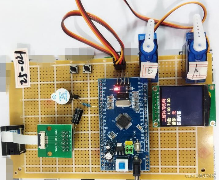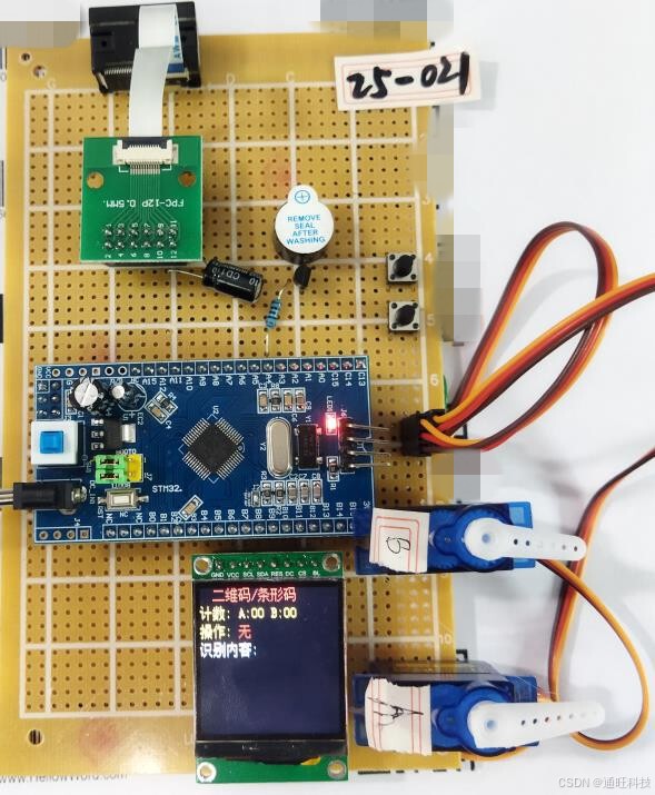 本本系统由STM32F103C8T6单片机核心板、二维码/条形码摄像头模块、1.44寸TFT彩屏、舵机驱动电路、蜂鸣器提醒电路、按键电路组成。