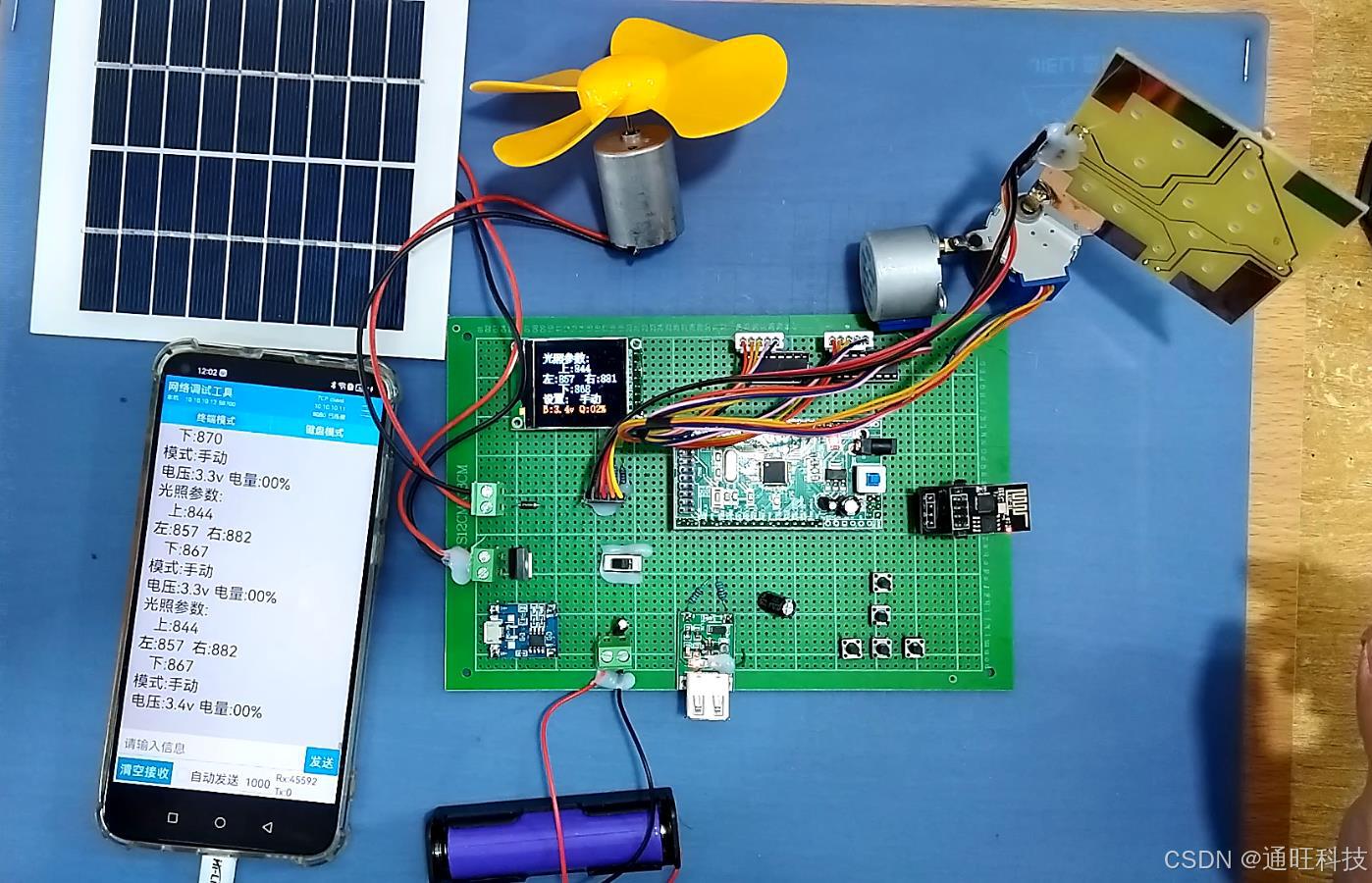 【3】“自动模式”:自动追寻光照较强的方向。如果上面光照采集高于下面光照,STM32单片机驱动上端电机向上翻转;如果下面光照采集高于上面光照,STM32单片机驱动上端电机向下翻转;如果上下光照采集几乎一致,上端电机不动作。同样的,如果左侧光照采集高于右侧光照,STM32单片机驱动下端电机向左侧转动;如果右侧光照采集高于左侧光照,STM32单片机驱动下端电机向右侧转动;如果左右光照采集几乎一致,下端电机不动作。从而自动实现,上下光照平衡,左右光照平衡,并且朝向光照较强的方向。