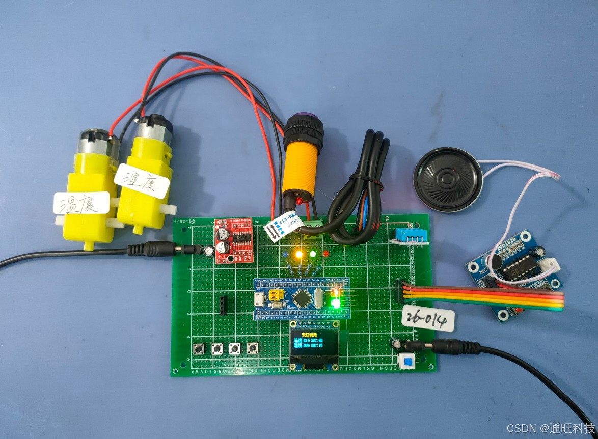 本设计由STM32F103C8T6单片机核心板、OLED屏、DHT11温湿度模块、两路电机控制、指示灯电路、E18红外避障模块、ISD1820语音模块电路、按键电路组成。