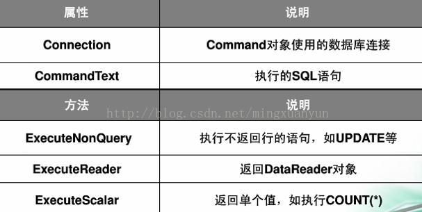 注意:Command 对象中的ExecuteNonQuery方法和ExecuteReader方法,由于没有弄清楚这两个,在做机房收费系统项目的时候,就出错了,调试的时候,调试了很长时间。