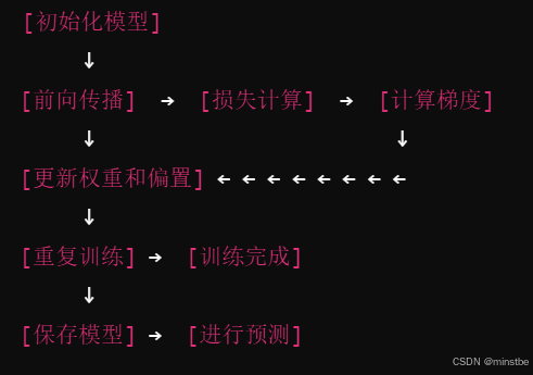 重复训练:步骤 2 到 5 会重复多次,直到达到设定的训练轮次或模型损失趋于稳定。