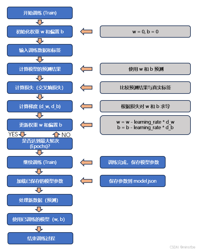 w和b,然后返回继续训练,直到达到预定的训练轮数(epochs)。 - 保存模型:训练完成后,保存当前的模型参数(