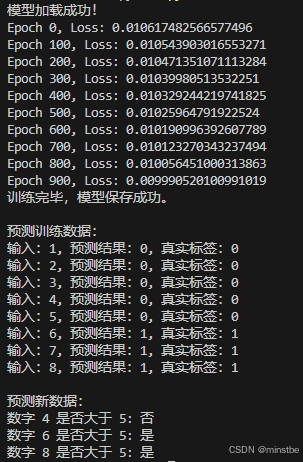 预测新数据: 在训练结束后,我们还可以使用训练好的模型来对新的数据进行预测(例如数字 4、6 和 8),判断这些数字是否大于 5。