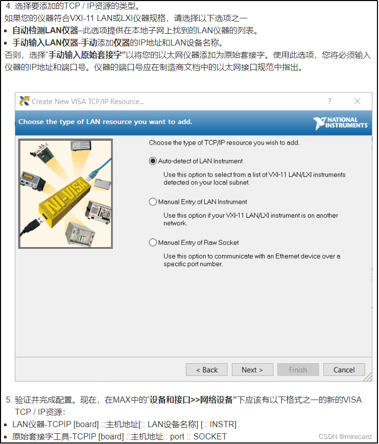 Step4:在labVIEW NI MAX中配置仪器,若进行至该步不成功,可将仪器关机重启。(可选第三项手动添加仪器,需在仪器文件中查看端口号。)