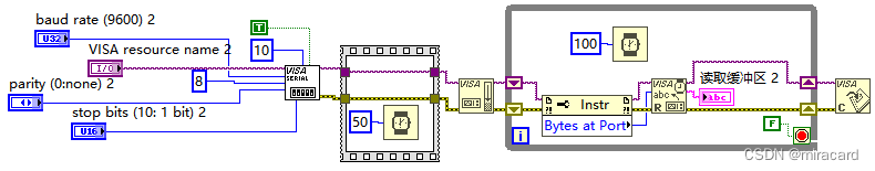 VISA清空I/O缓冲区:大多数情况下串口设备不管在labVIEW执行或者关闭的状态都一直在上传数据。端口在收到第一个字符的时候可能没有被配置好,所以此时它读到的是无效信息,这样读写数据容易导致错误。所以在串口配置完成后可放置一个延时,就可以让串口有足够的时间完成设定。再使用VISA清空I/O缓冲区函数,就可以将缓冲区中不正确的资料清除,对串口读取功能进行优化。