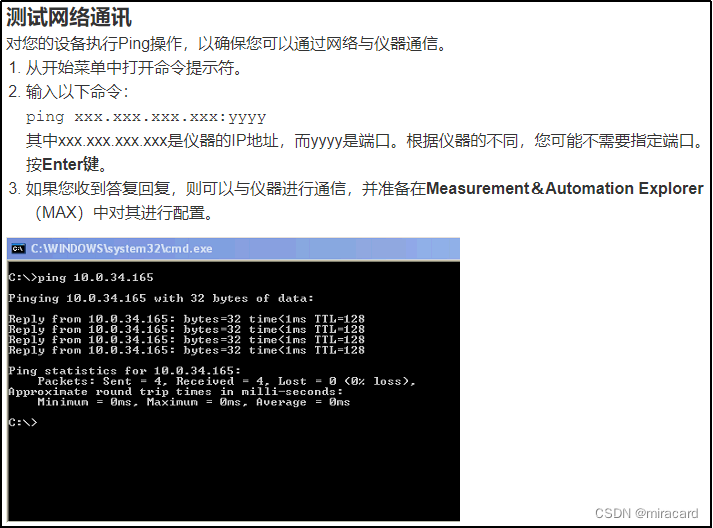 Step3:通过对设备执行指令“ping”操作,确保电脑可通过网络与仪器通讯;