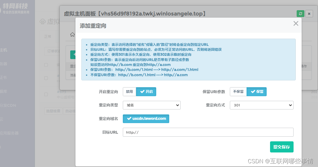 目标URL:填写你需要重定向到的站点,必须为可正常访问的URL,否则将返回错误