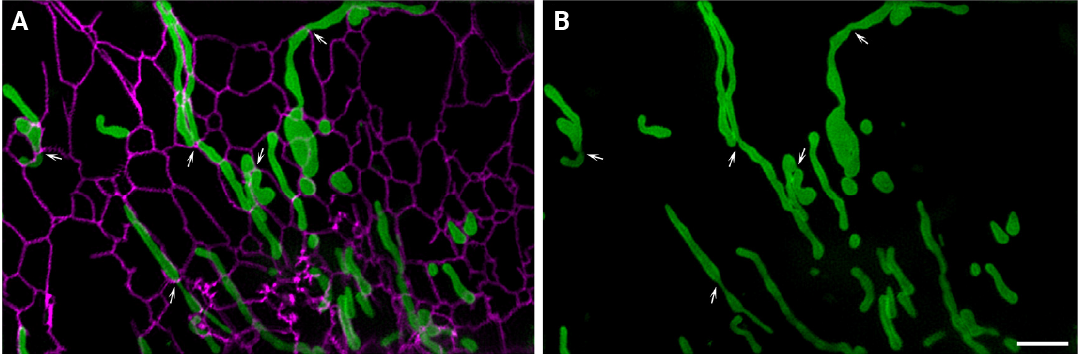 图 7. A. 线粒体 (绿色) 和内质网 (洋红色) 的接触;B. 仅线粒体绿色通道。白色箭头指示线粒体和内质网接触位点的线粒体收缩和分裂[6]。