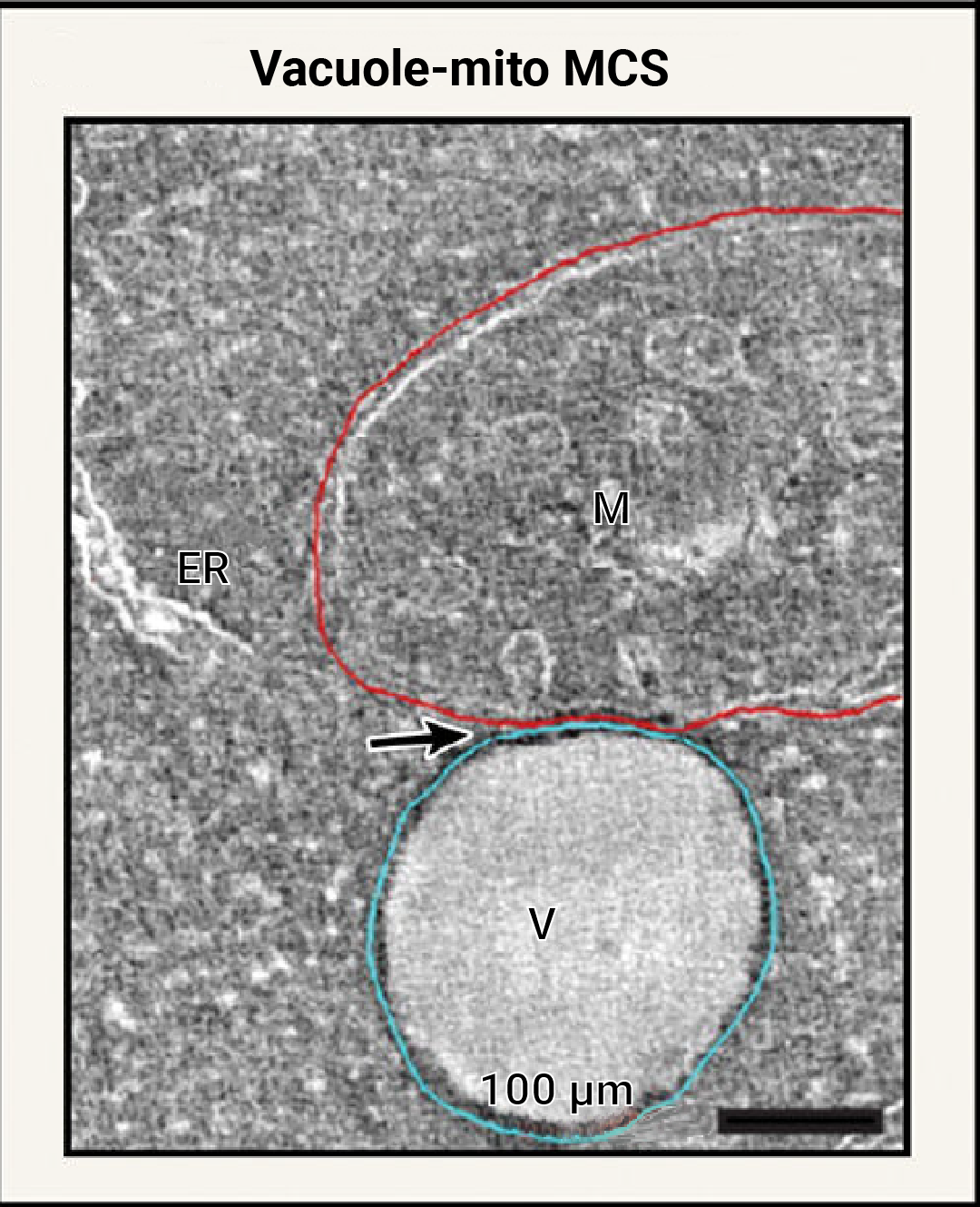 图 8. 在出芽酵母中,线粒体 (M) 与溶酶体等效液泡 (v) 形成 MCS[2]。