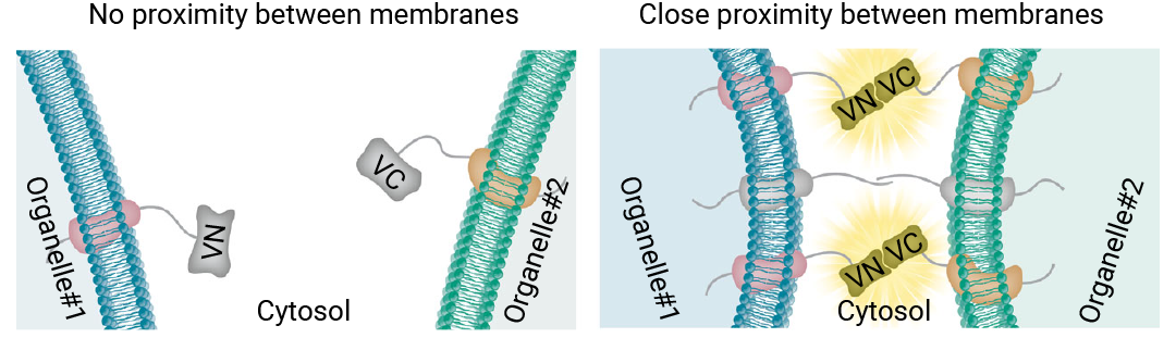 简而言之,使用了一种分裂式荧光探针,Venus 荧光蛋白的一半包被每个细胞器的周边。在两个细胞器之间的接触位点区域,两半 Venus 荧光蛋白相互作用,形成完整的荧光团 (图 4)。