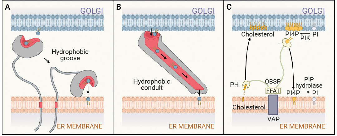 (A) 具有疏水沟槽或口袋的脂质转运蛋白从供体细胞器膜 (蓝色) 中提取磷脂,并催化其转移到受体细胞器膜 (灰色)。疏水沟槽在转运过程中保护脂质免受胞质溶胶的影响。(B) 具有管状疏水通道的脂质转运体形成稳定的脂质转移途径,用于在系留细胞器膜之间转移脂质。(C) 脂质转运蛋白在膜接触位点 (MCS) 处调节细胞器膜的脂质组成。尽管内质网 (ER) 中的胆固醇水平远低于高尔基体,但 OSBP 仍能将胆固醇从内质网转运至高尔基体。为了实现这一目标,OSBP 将高尔基体脂质 PI4P 与内质网胆固醇进行交换。在内质网中,PI4P 水解为 PI 以维持较大的 PI4P 浓度梯度。