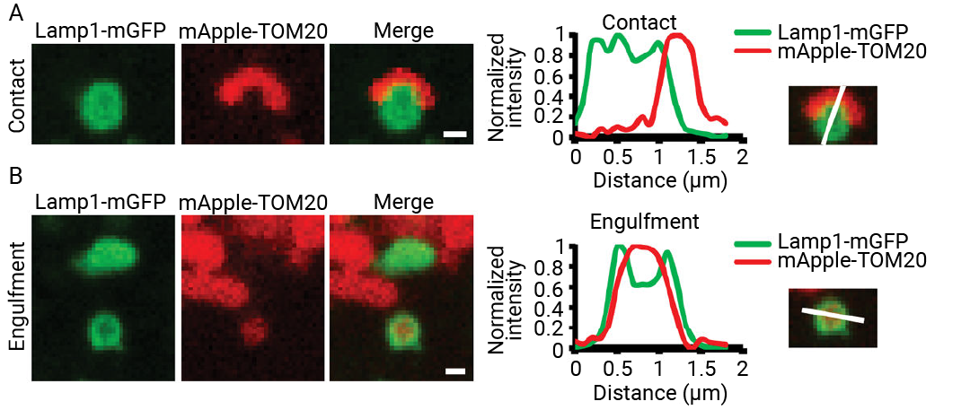 图 9.表达 LAMP1-mGFP (溶酶体) 和 mApple-TOM20 (外部线粒体外膜) 的活体 HeLa 细胞内溶酶体-线粒体互作的表征[7]。