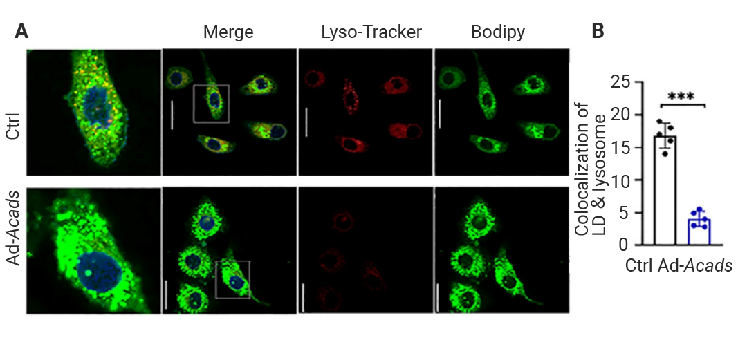 下面让我们来看一例 MCE 产品标记细胞器的文献实操。Su 等人报道了短链酰基-COA 脱氢酶 (short-chain acyl-CoA dehydrogenase, SCAD) 通过乙酰辅酶 A 依赖的脂噬通路加速衰老相关的肝脏脂肪变性,文中使用 BODIPY 493/503 (HY‐W090090) 和 LysoTracker Red (HY‐D1300)分别对 HepG2 细胞中的脂滴和溶酶体进行标记和共定位分析。