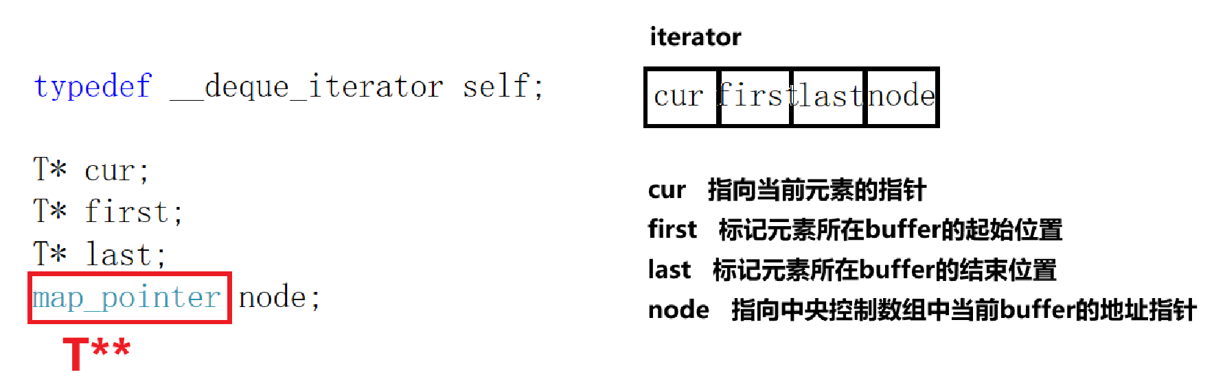 首先,是对迭代器的改造。就像list,底层空间不连续,需要通过重载运算符来达到预期目的。不过改造之后的deque迭代器包含四个成员,分别是cur(指向当前元素的指针)、first(标记元素所在buffer的起始位置)、last(标记元素所在buffer的结束位置)以及node(指向中央控制数组中当前buffer的地址指针)。而它自身有着两个迭代器,一个start迭代器,一个finish迭代器。值得注意的是start迭代器指向deque的起始buffer,finish迭代器指向deque的目前最后一个buffer。以下是linux系统某版本里里iterator的成员变量。