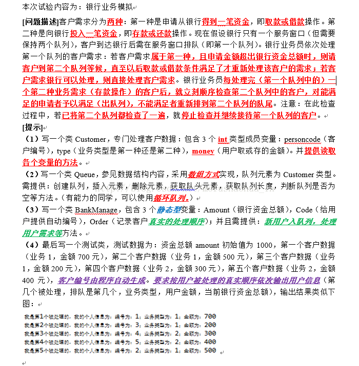 Queue Q3 = new Queue(SIZE); //Q3是一个临时队列,先将仍然不能取款的请求放入Q3,在Q2中所有取款判断完后(判断能否执行,能就取款,不能就插入队尾,但为了能够跳出循环,新建Q3作为中转队列),再将Q3中的所有取款操作,重新入队Q2
